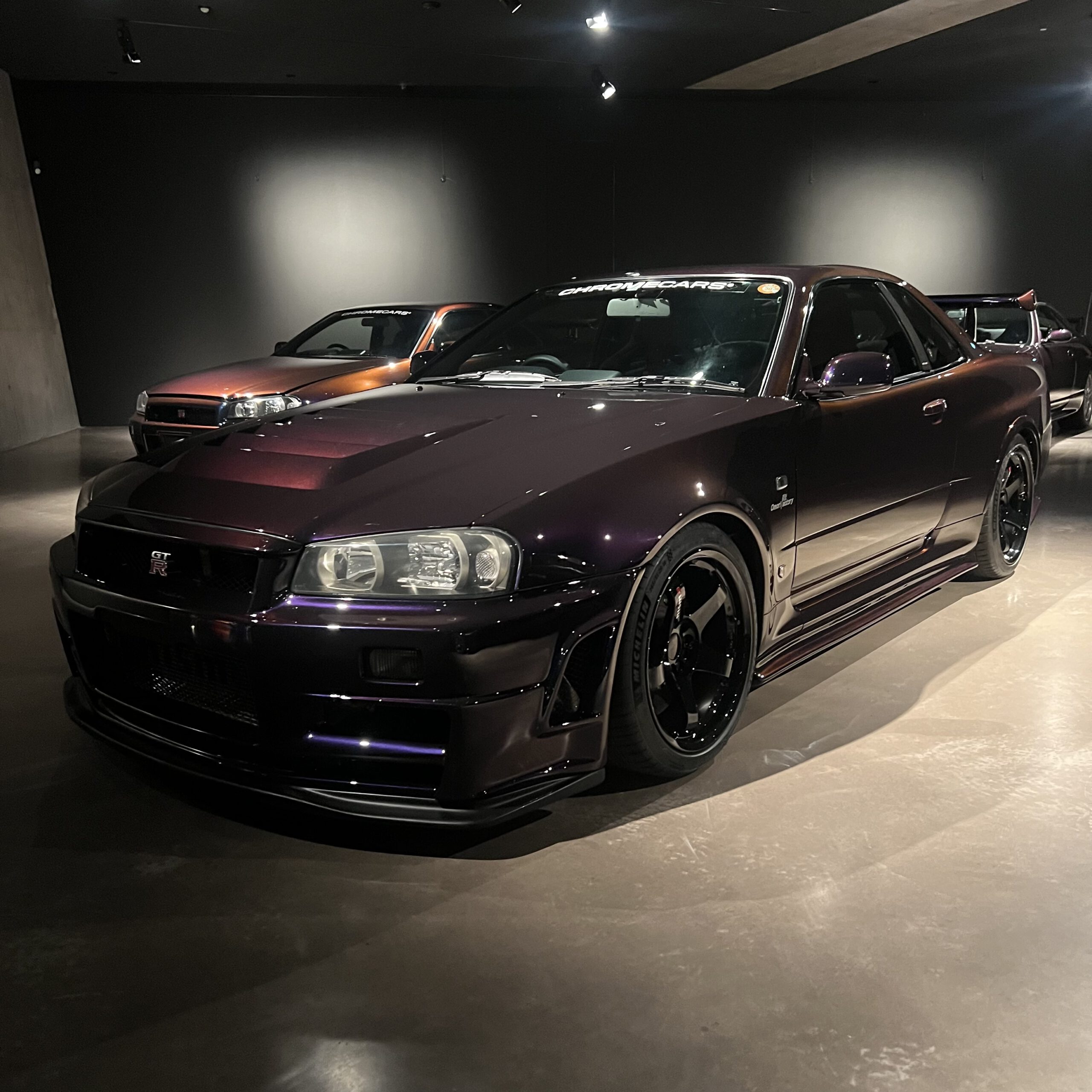 Eine Legende unter den JDM-Ikonen: Der R34 GT-R in der Clubman Race Spec sowie der extrem seltenen Farbe Midnight Purple III (nur 132 Exemplare weltweit). Je nach Lichteinfall schimmert der Lack von Violett über Blau bis hin zu Bronzegrün – ein einzigartiges Farbenspiel, das diesen Wagen zu einem Sammlerstück macht.